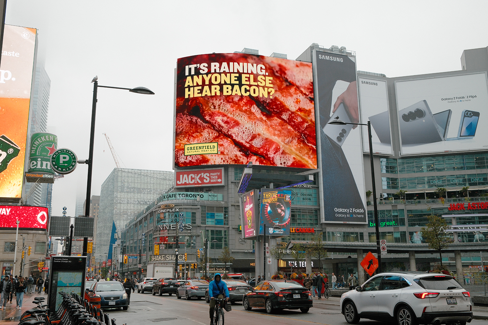Greenfield Bacon is Rain Campaign at Yonge & Dundas